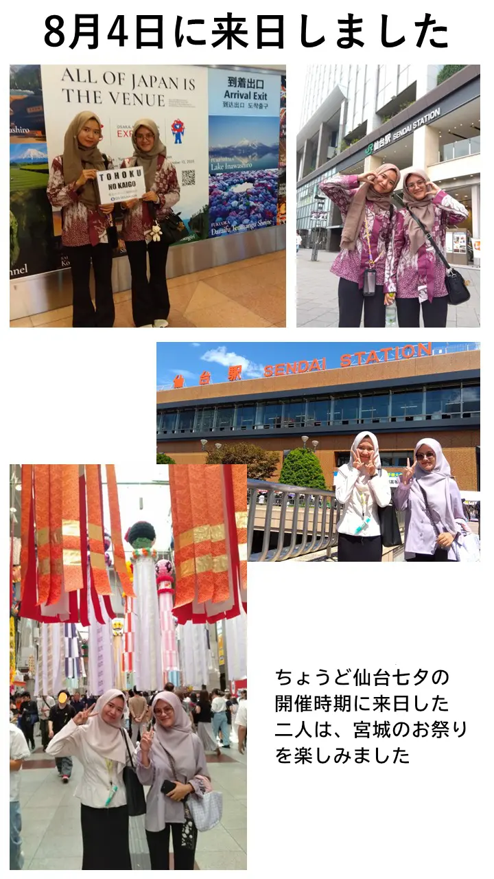 8月4日に来日した二人は、ちょうど仙台七夕の時期と重なり、宮城のお祭りを体感していただきました。 二人は8月11日から、法人研修を受けたあと、現場での勤務が始まります。